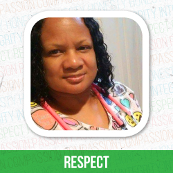 Headshot of Charlene Revell with the text "respect" printed underneath