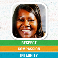Headshot of Jeanne Maclin smiling with the words "respect," "compassion," and "integrity" printed behind her
