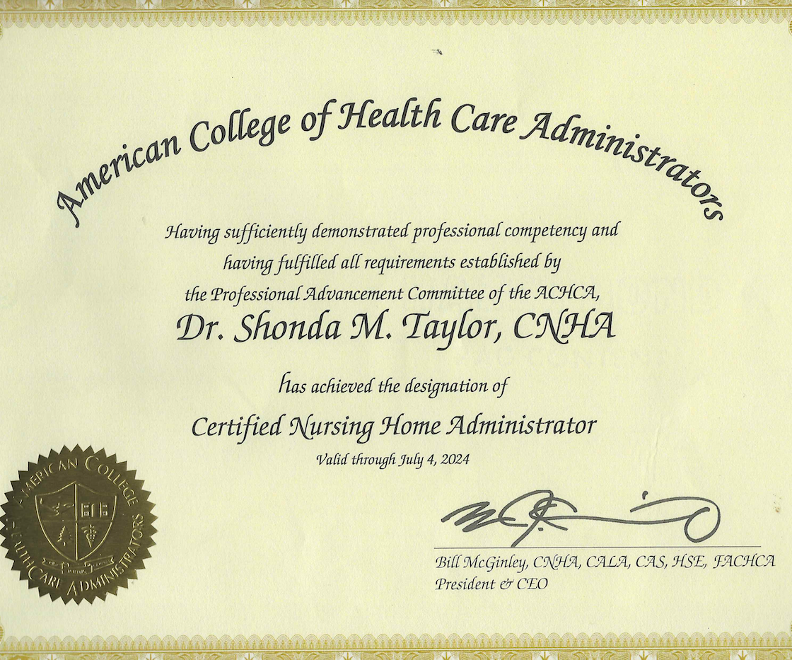 Image of Shonda Taylor's Certified Nursing Home Administrator certificate