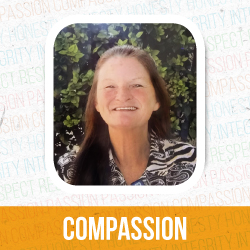 Headshot of Susan Kent smiling with the word "compassion" printed below her