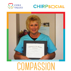 Carla Lanane was recognized for demonstrating one of Consulate Health Care’s core values, Compassion.