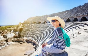 Elderly woman wears sunglasses and floppy hat as she sits smiling and admiring the scenery of an ancient amphitheater on a sunny day